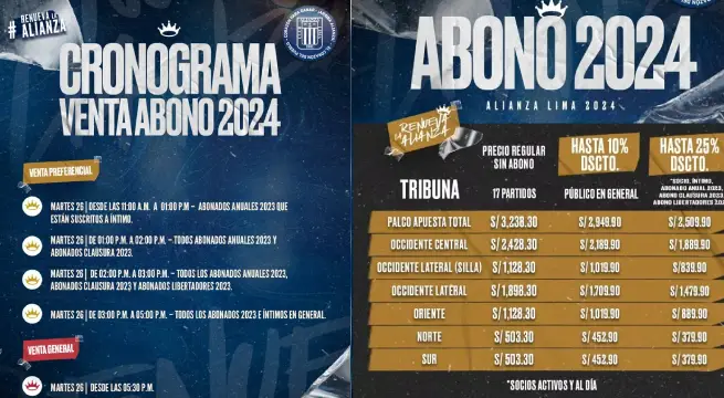 La venta de los abonos inició hoy, martes 26 de diciembre, a partir de las 11:00 a.m. de Perú, según el cronograma compartido por Alianza Lima a través de sus redes sociales. La plataforma de Joinnus es el medio por el cual los apasionados seguidores podrán adquirir sus beneficios.