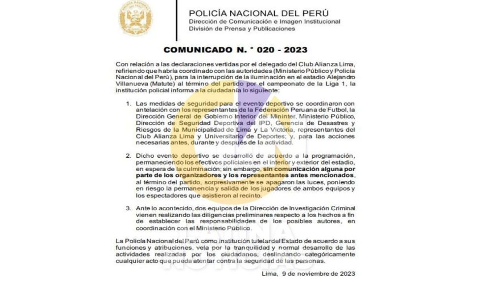 La Policía Nacional del Perú (PNP) se pronunció a través de un comunicado en el que desmiente haber coordinado con autoridades de Alianza Lima apagar las luces del estadio Alejandro Villanueva ‘Matute’ tras la victoria de Universitario de Deportes.