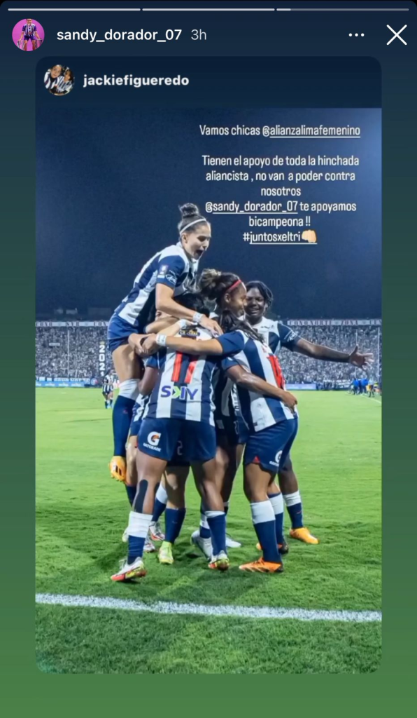 Luego de conocerse el castigo impuesto por la comisión de la FPF, la futbolista se pronunció en sus redes sociales. A través de su cuenta de Instagram, compartió la historia de una hincha ‘grone’, con una imagen de una celebración y palabras de motivación para el equipo.