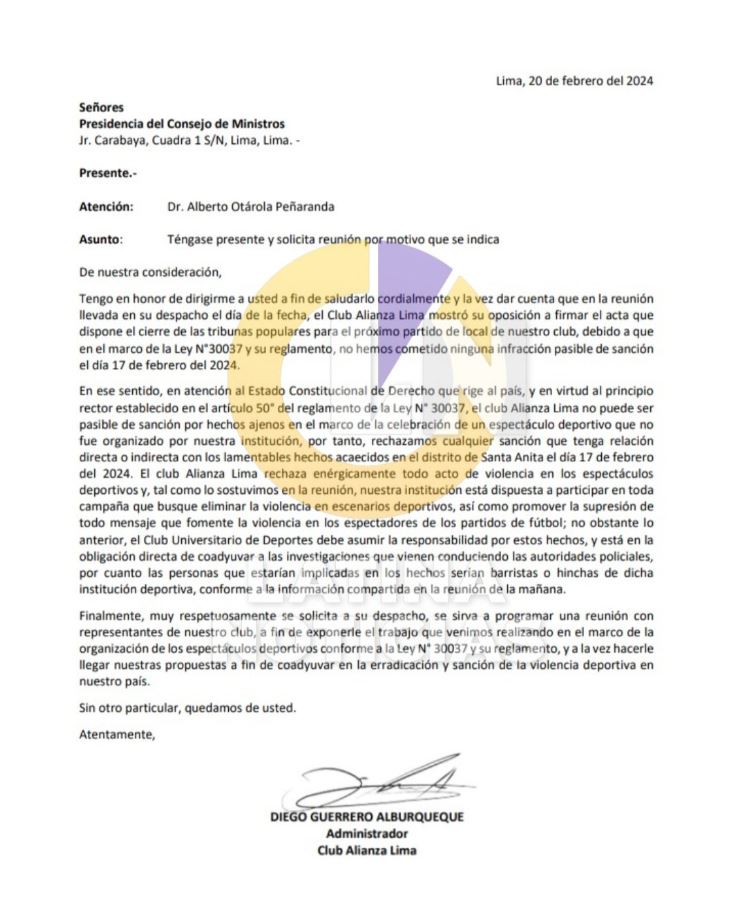 “Rechazamos cualquier sanción que tenga relación directa o indirecta con los lamentables hechos acaecidos en el distrito de Santa Anita el día 17 de febrero del 2024. El club Alianza Lima rechaza enérgicamente todo acto de violencia en los espectáculos deportivos”, se lee en una parte del documento.