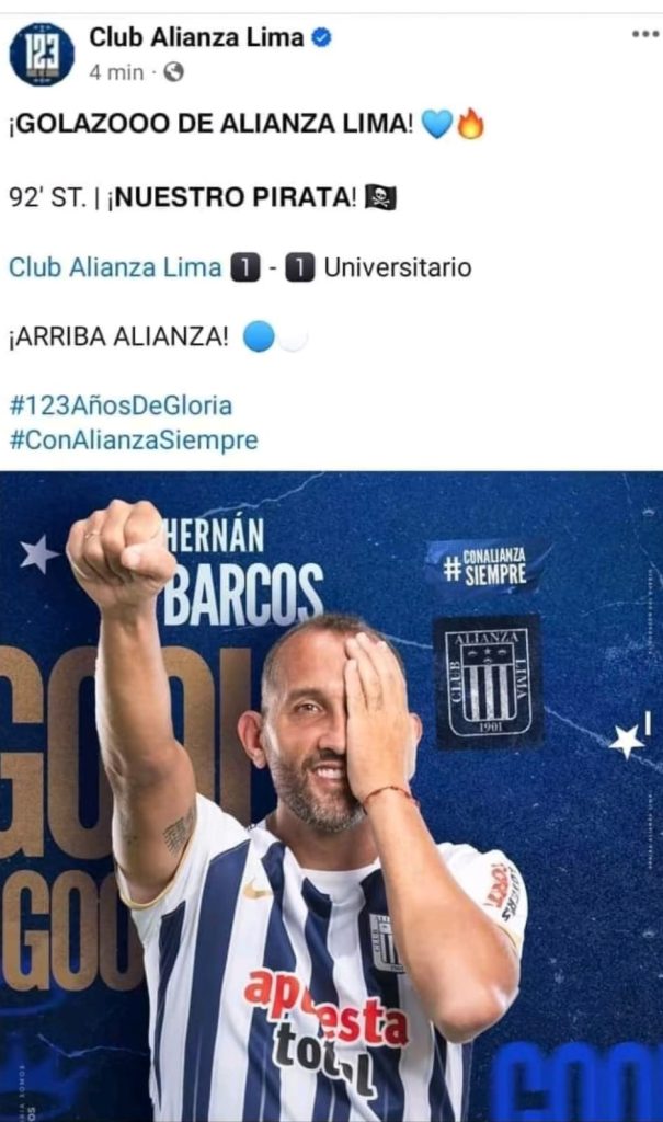 A través de su cuenta oficial de Facebook, los “grones” publicó un flyer segundo después de que Hernán Barcos anotara el gol del empate. “¡Golazooo de Alianza Lima!”, colocó como descripción en su post.