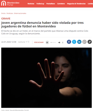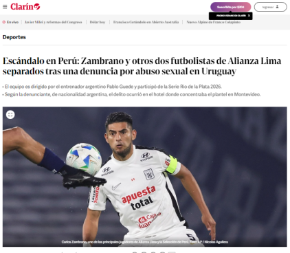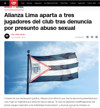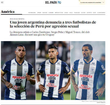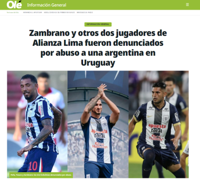 El fútbol peruano vuelve a captar la atención internacional tras hacerse pública la denuncia por presunto abuso sexual a una joven argentina de 22 años por parte de tres jugadores de Alianza Lima: Carlos Zambrano, Miguel Trauco y Sergio Peña. Diversos portales de prensa extranjera informan sobre esta grave acusación.