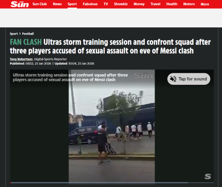 The Sun (Irrumpen entrenamiento y se enfrentan a plantel tras acusación de agresión sexual contra tres jugadores, en vísperas del choque con Messi)