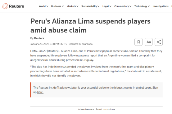 Reuters (Alianza Lima suspende a jugadores en medio de denuncias de abuso)