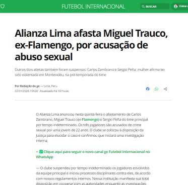 Globo Esporte de Brasil (Alianza Lima despide a Miguel Trauco, exjugador de Flamengo, por acusaciones de abuso sexual)