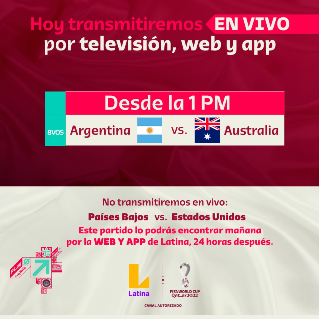 Hoy se enfrentan Argentina vs Australia por los octavos de final de la Copa del Mundo Qatar 2022. El cuadro ‘albiceleste’ parte con la ventaja de la experiencia. Sin embargo, Australia demostró ser un equipo sólido en defensa y eficaz cuando tienen la oportunidad de atacar a su rival. Este partido se podrá disfrutar EN VIVO por Latina TV y en sus multiplataformas (Web y APP).