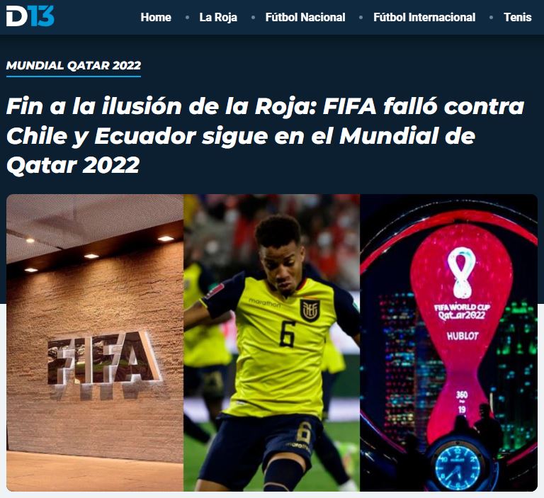 “Se apagó la ilusión de llegar a Qatar 2022. Finalmente, la FIFA se pronunció tras la denuncia de la Federación de Fútbol de Chile por el caso de Byron Castillo y determinó, en un fallo publicado este viernes, desestimó todos los cargos contra la Federación Ecuatoriana de Fútbol, por lo que el sueño de Chile de ir a la Copa del Mundo por secretaría quedó desechado”.