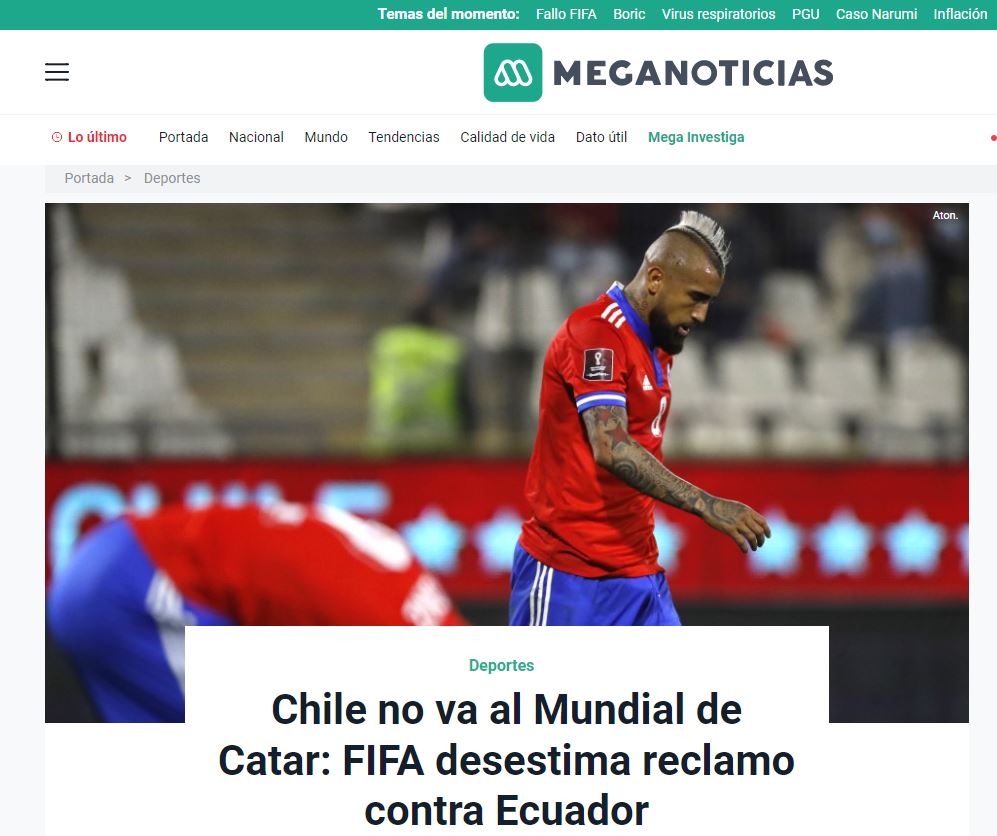 “La FIFA entregó su veredicto y desestimó el reclamo de Chile por el Caso Byron Castillo, por lo que la Roja no irá al Mundial. Sin embargo, la ANFP anunció que apelará al Tribunal Máximo de Arbitraje en el deporte (TAS)”.