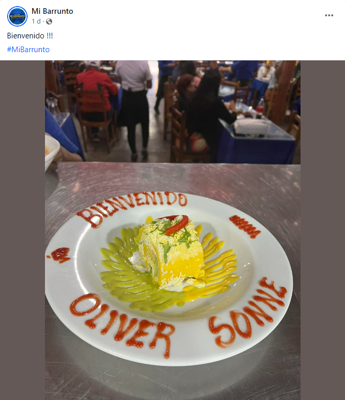 “Bienvenido Oliver Sonne”, se lee en el plato publicado en redes sociales y es el famoso regalo que da dicha cevichería para recibir a sus personajes más queridos y reconocidos.