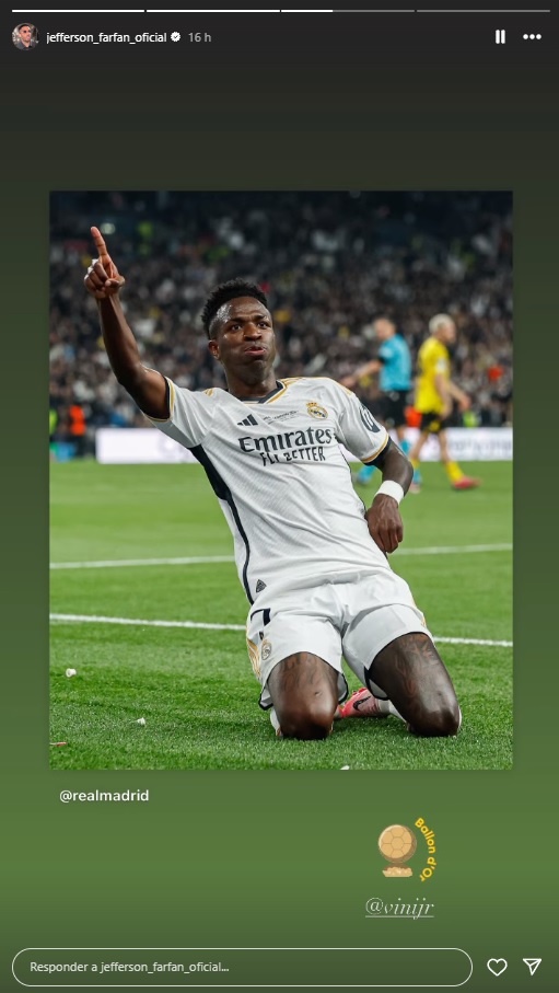 En su cuenta de Instagram, Farfán compartió una imagen de la celebración de Vinícius Júnior tras el triunfo del Real Madrid. Lo que llamó la atención de sus seguidores fue el uso de un sticker muy especial: el emoji del Balón de Oro. Este gesto de Farfán sugiere que considera a Vinícius como un merecedor potencial del prestigioso premio, reservado para los mejores jugadores del mundo.
