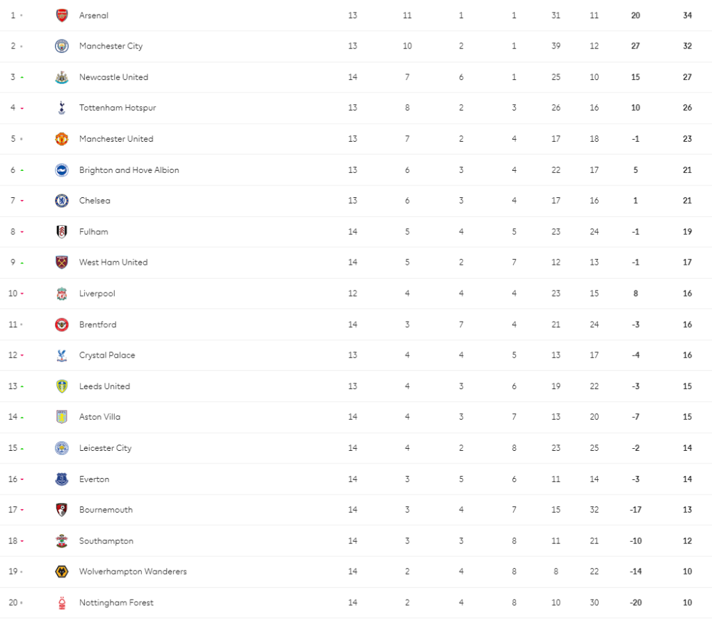 Así va la tabla (hasta el momento) de la presente Premier League ha falta de que se complete la jornada 13.
