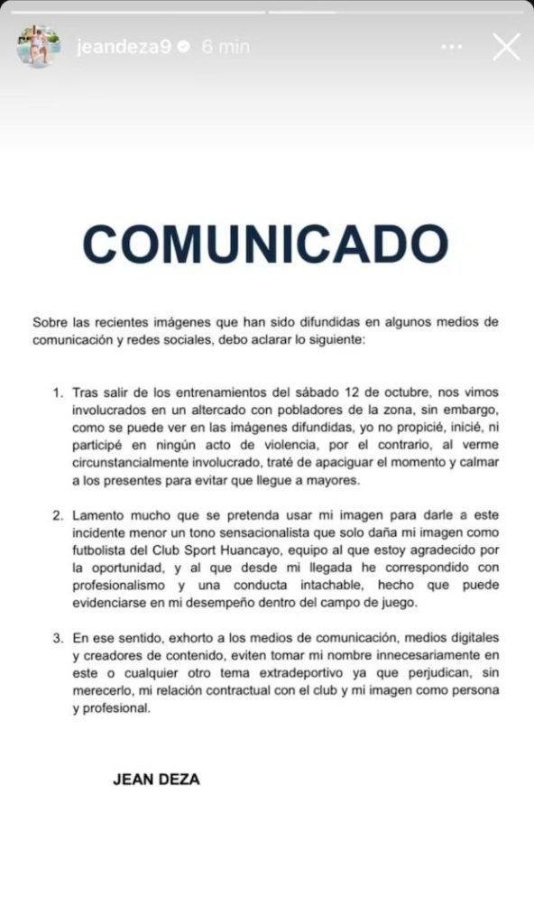 A través de su cuenta de Instagram, Jean Deza se pronunció sobre las imágenes en las que se aprecia a entre sus compañeros de equipo mantener una fuerte pelea con un grupo de obreros en Huayucachi.