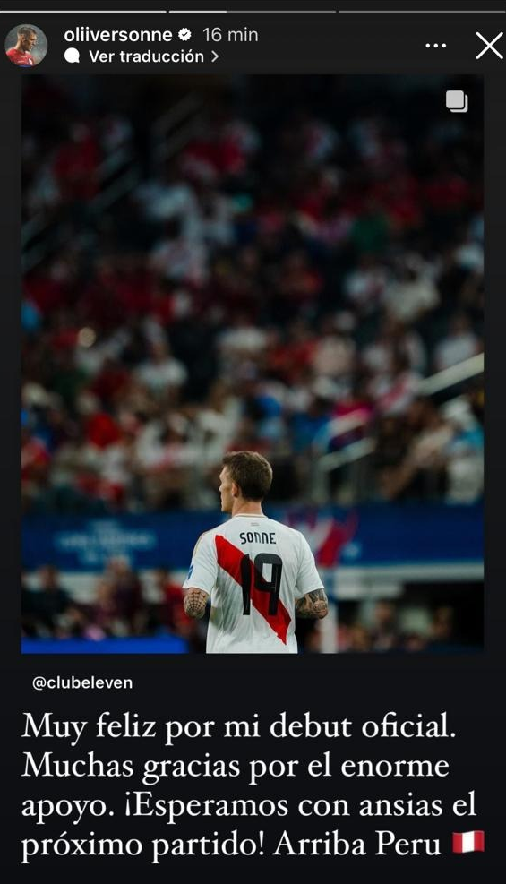 A través de sus redes sociales, el lateral peruano de raíces danesas, Oliver Sonne, se mostró muy contento por el debut en competiciones oficiales con la selección peruana.