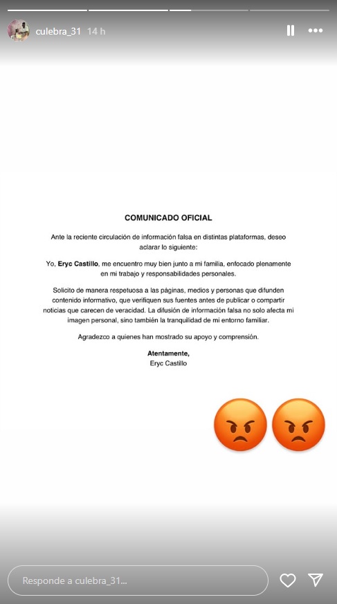 El atacante ‘grone’ salió a aclarar la situación y mencionar que la información difundida es falsa. “Ante la reciente circulación de información falsa en distintas plataformas, deseo aclarar lo siguiente: Yo, Eryc Castillo, me encuentro muy bien junto a mi familia, enfocado plenamente en mi trabajo y responsabilidades personales”, indicó.