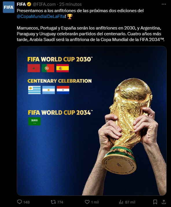 El miércoles, la FIFA reveló oficialmente que España, Portugal y Marruecos serán los anfitriones de la Copa del Mundo 2030, mientras que Arabia Saudita se prepara para recibir el torneo en 2034. La confirmación fue hecha por Gianni Infantino, presidente de la FIFA, durante un congreso extraordinario virtual, donde ambas candidaturas fueron aprobadas por aclamación.
