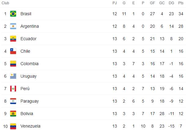 Tabla de posiciones de las Eliminatorias