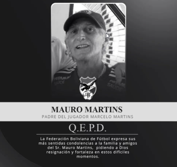 “La Federación Boliviana de Fútbol expresa sus más sentidas condolencias a la familia y amigos del Sr. Mauro Martins, pidiendo a Dios resignación y fortaleza en estos difíciles momentos”, se lee en el mensaje.
