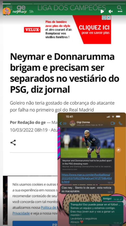 En otra de sus historias, Neymar afirmó que no le gustaba responder a este tipo de noticias. “Odio venir aquí y hablar de noticias… pero esto del post anterior es mentira. No hubo pelea dentro del vestuario. Periodistas incompetentes que quieren promocionarse, corroboren a la siguiente”, manifestó.