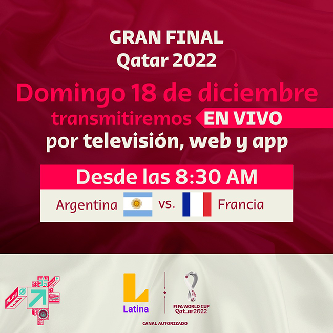 El Mundial Qatar 2022 llega a su fin este domingo 18 de diciembre con la ceremonia de clausura, y posterior a ello el partido entre Argentina vs. Francia. La final del evento deportivo será transmitida en vivo y directo por la señal abierta, web y app de Latina Televisión.