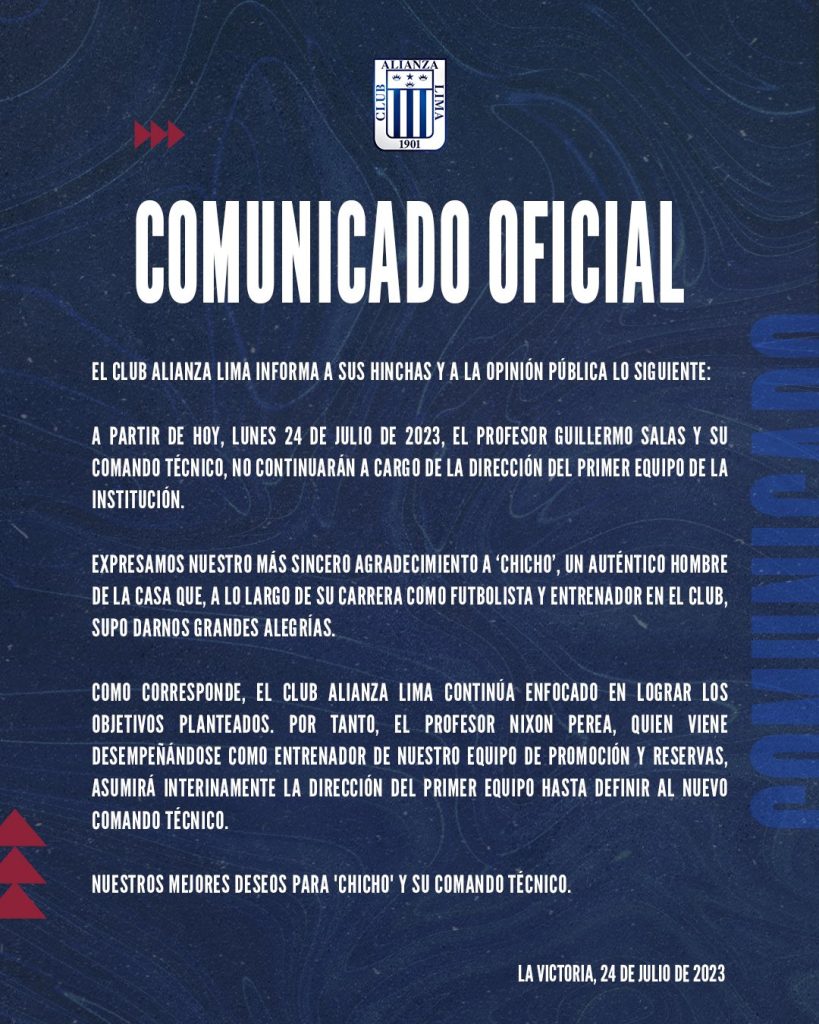 Asimismo, Alianza precisó que el colombiano Nixon Perea, entrenador del equipo de reservas, asumirá como técnico interino del primer equipo, mientras se busca a un nuevo comando técnico para culminar lo que resta de la temporada 2023.