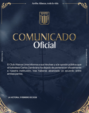 “El Club Alianza Lima informa a sus hinchas y a la opinión pública que el futbolista Carlos Zambrano ha dejado de pertenecer oficialmente a nuestra institución, tras haberse alcanzado un acuerdo entre ambas partes”, se lee en el comunicado.