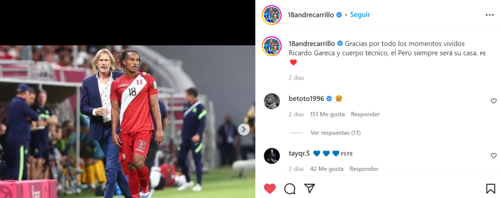 “Gracias por todo los momentos vividos Ricardo Gareca y cuerpo técnico, el Perú siempre será su casa”, colocó la ‘Culebra’ , mientras que el nuevo delantero de Chivas de México publicó una peculiar imagen, en donde Gareca le llamaba la atención. “Gracias por todo profesor. Eternamente agradecido”, fue su mensaje.