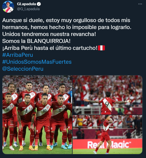 “Aunque si duele, estoy muy orgulloso de todos mis hermanos, hemos hecho lo imposible para lograrlo. ¡Unidos tendremos nuestra revancha! ¡Somos la Blanquirroja! ¡Arriba Perú hasta el último cartucho!”, escribió el delantero en Instagram.