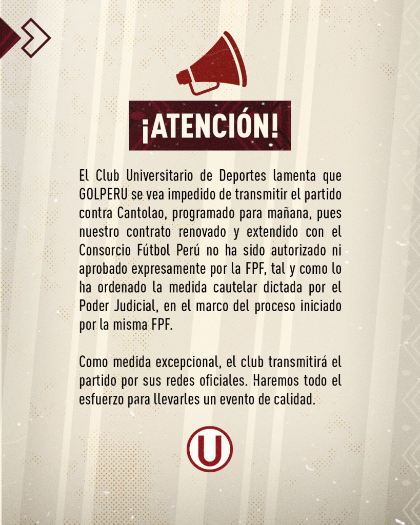 Previamente, la propia FPF indicó que había enviado una comunicación oficial al consorcio, donde se daba autorización para transmitir los duelos de local del cuadro merengue. La medida también alcanza a Sport Boys, Carlos A. Mannucci y Deportivo Municipal.