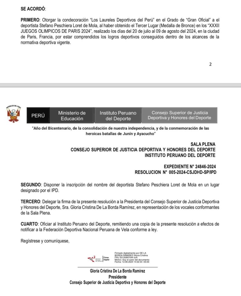 El Gobierno, a través de una resolución del Instituto Peruano del Deporte (IPD), oficializó los Laureles Deportivos en el grado de “Gran Oficial” para Stefano Peschiera por su obtención de la medalla de bronce en París 2024.
