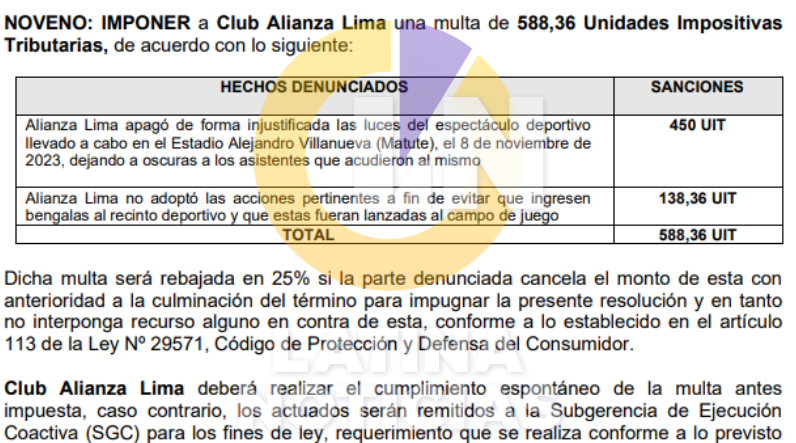 La Comisión de Protección al Consumidor N.°2 del Indecopi, en primera instancia, impuso al club Alianza Lima una multa total de 588.36 UIT, equivalente a S/ 3 030 054, debido a que apagó las luces del estadio Alejandro Villanueva luego de culminar el partido de vuelta contra Universitario de Deportes en noviembre del año pasado y permitió el ingreso de bengalas por parte de sus hinchas.