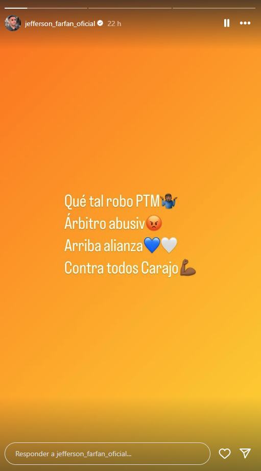 “Que tal robo, árbitro abusivo. Arriba Alianza, contra todos caraj*”, escribió la ‘Foquita’ en su cuenta de Instagram una vez que terminó el partido en Piura. Y es que el polémico penal que cobró Joel Alarcón, hizo que los norteños anotaran en los últimos minutos de partido y ganaran los tres puntos.