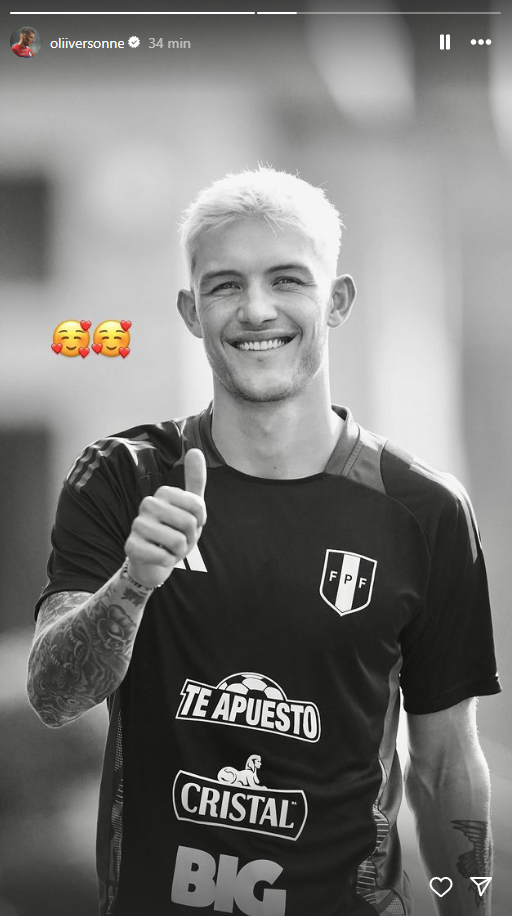 Tras su convocatoria, Oliver Sonne utilizó su cuenta oficial de Instagram para mostrar su felicidad de haber sido convocado nuevamente a la selección peruana. El ‘Vikingo’ posteó una imagen en blanco y negro con la indumentaria de la ‘Bicolor’ y añadió algunos emojis.