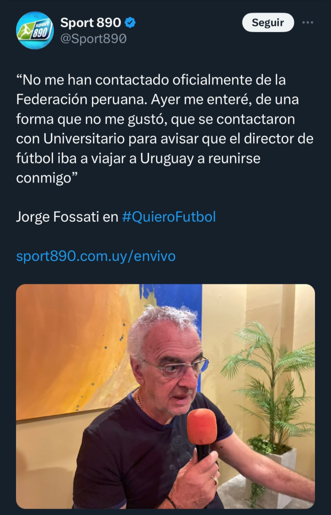 “No tengo una posición formada respecto a esta posibilidad (dirigir a Perú). Había un técnico trabajando. Es un orgullo que se hable de mi, pero no he tenido contacto alguno (…) Universitario hoy es mi prioridad y realidad. Así nos reuniéramos hoy, no sé cuál es el proyecto que me plantearán, deportivo, económico, todo eso“. agregó Fossati.