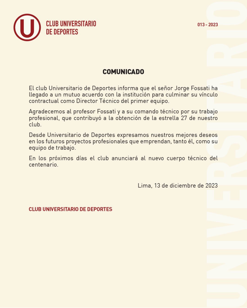 “El club Universitario de Deportes informa que el señor Jorge Fossati ha llegado a un mutuo acuerdo con la institución para culminar su vínculo contractual como director técnico del primer equipo”, se lee en el comunicado.