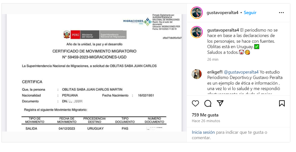 Durante las primeras horas del medio día, el periodista Gustavo Peralta confirmó la salida de Juan Carlos Oblitas hacia Uruguay, tras mostrar el documento migratorio en sus redes sociales.