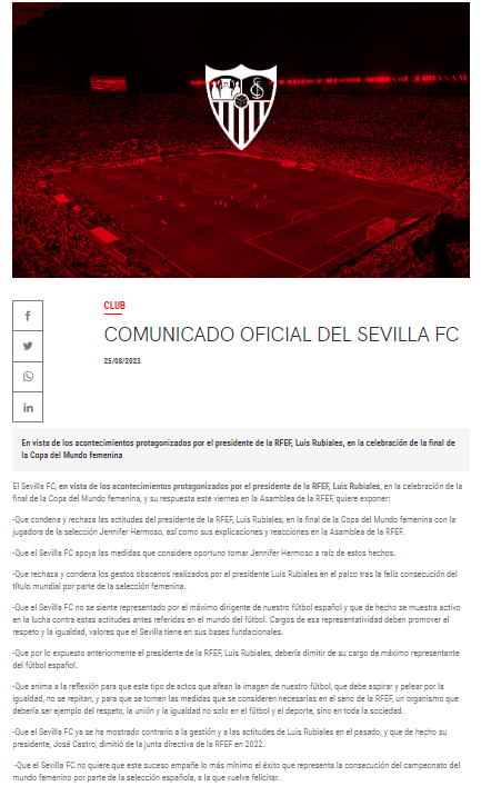 El Sevilla emitió un duro comunicado en donde señala que la institución no se siente representada por Luis Rubiales a cargo y que “debería dimitir de su cargo”.