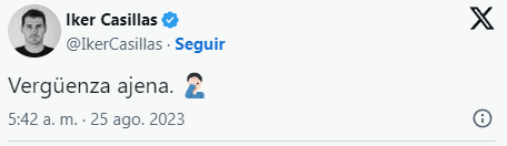 Iker Casillas, excapitán de la selección española campeona del mundo y de Europa, aseguró que sintió “vergüenza ajena” al ver las explicaciones de Luis Rubiales. “¡Tendríamos que estar estos 5 días hablando de nuestras chicas! ¡De la alegría que nos dieron a todos! De presumir de un título que no teníamos en el fútbol femenino pero…”, continuaba Casillas en otro tuit.