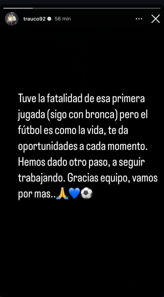 “Tuve la fatalidad de esa primera jugada (sigo con bronca) pero el fútbol es como la vida, te da oportunidades a cada momento. Hemos dado otro paso, a seguir trabajando. Gracias equipo, vamos por más…”, se lee en el mensaje.