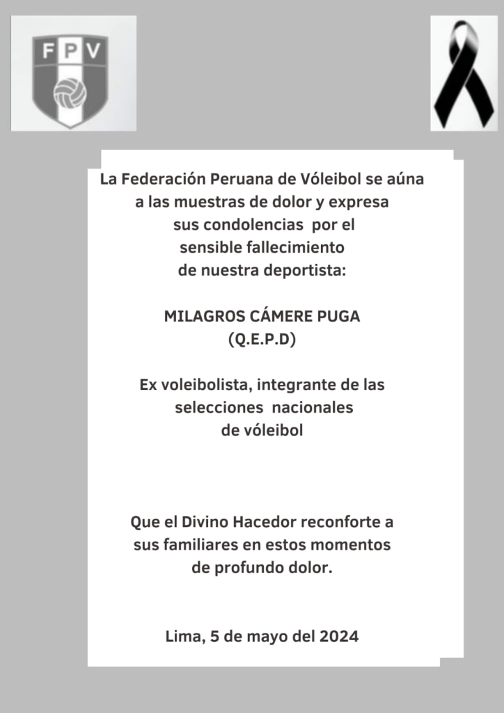 El Comité Olímpico Peruano lamenta profundamente el fallecimiento de la ex voleibolista y capitana de la selección Milagros Beatriz Cámere Puga, deportista olímpica en Atlanta 1996 y Sidney 2000. Extendemos nuestro pesar a sus familiares, amigos y al deporte nacional. pic.twitter.com/zI4NE5LemR