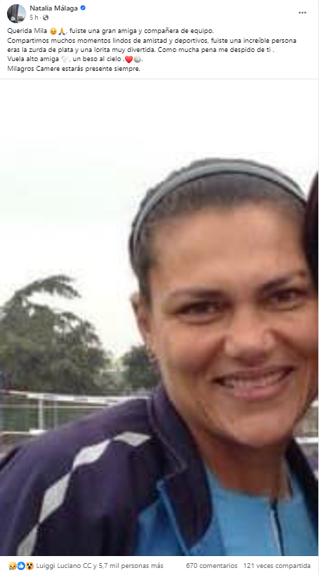 “Fuiste una increíble persona, eras la ‘zurda de plata’ y una lorita muy divertida. Con mucha pena me despido de ti. Vuela alto, amiga. Un beso al cielo. Milagros Cámere, estarás presente siempre“, escribió la exvoleibolista y entrenadora en su cuenta oficial de Facebook.