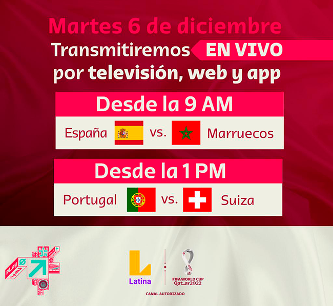 Este martes 6 de diciembre se cierra la actividad de los octavos de final con dos partidos. Marruecos vs. España, en el Education City Stadium. A continuación, Portugal vs. Suiza, en el Estadio Lusail. Cabe mencionar que, ambos encuentros serán transmitidos en vivo y directo por televisión, web y app de Latina.