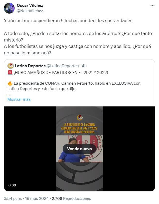 En medio del escándalo por los presuntos amaños de partidos en el fútbol peruano durante los años 2021 y 2022, la presidenta de la Comisión Nacional de Árbitros (Conar), Carmen Retuerto, sacudió los cimientos del deporte al revelar detalles sobre las investigaciones y suspensiones de árbitros implicados. Este sombrío panorama no pasó desapercibido para Óscar ‘Neka’ Vílchez, exfutbolista de Alianza Lima, quien optó por expresar su descontento de manera sarcástica a través de las redes sociales.