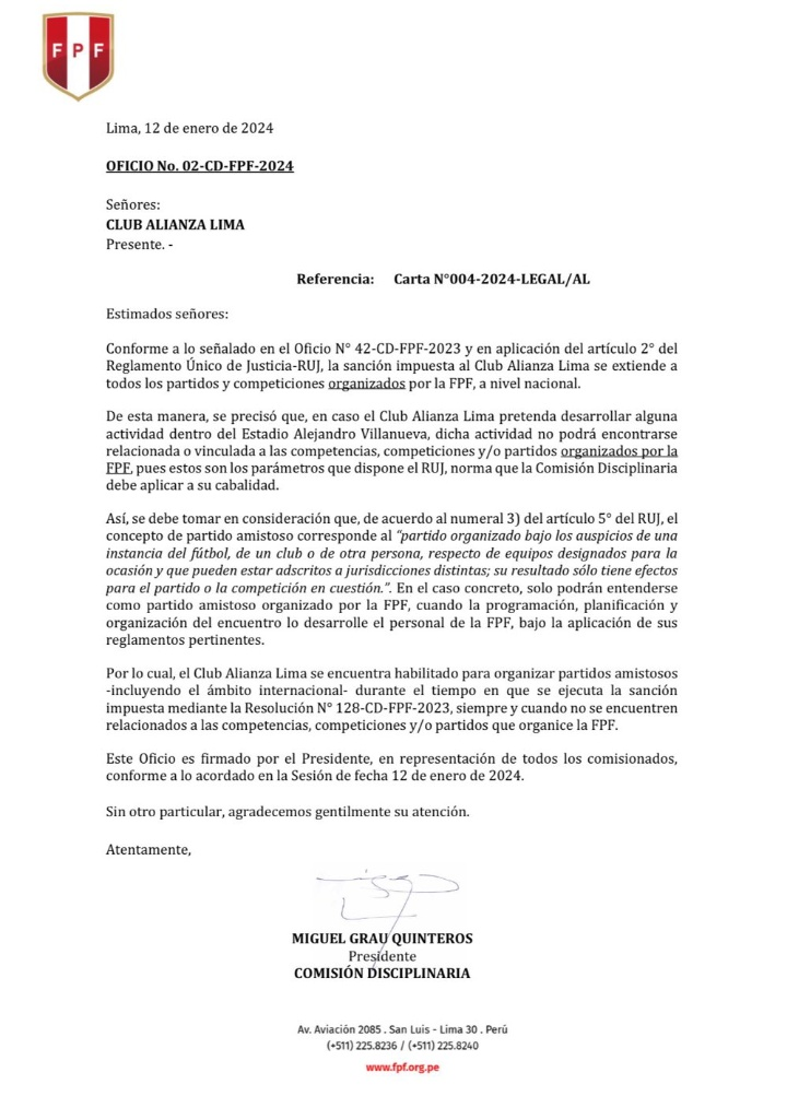 Si bien Alianza Lima solicitó a la CD-FPF que se precise sobre todas las actividades estaban prohibidas a realizarse en Matute, obtuvieron una respuesta a tres días del evento. Cabe mencionar que desde la FPF indicaron que los partidos amistosos, sí se podrán realizar en Matute, más no los encuentros organizados por la FPF.