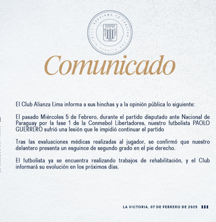 Luego de la lesión que sufrió Paolo Guerrero en encuentro de Alianza Lima ante Nacional de Paraguay, en Asunción, por la Fase 1 de la Copa Libertadores 2025, el club blanquiazul brindó detalles del parte médico del delantero.