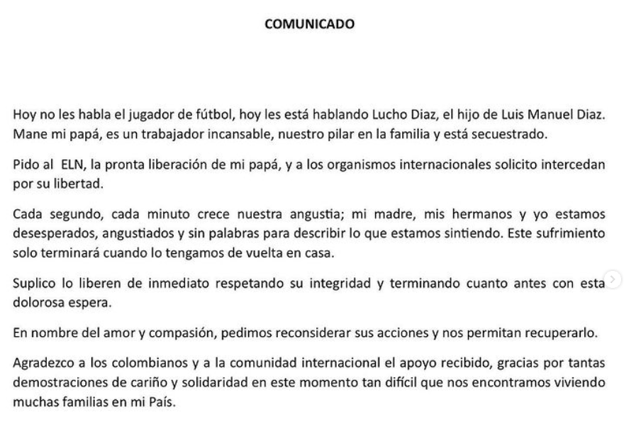 Mediante su cuenta de Instagram, el jugador exigió al grupo terrorista la pronta liberación de su padre, a quien catalogó como «un trabajador incansable y un pilar en la familia», así como la intermediación de organismos internacionales para que recupere su libertad.