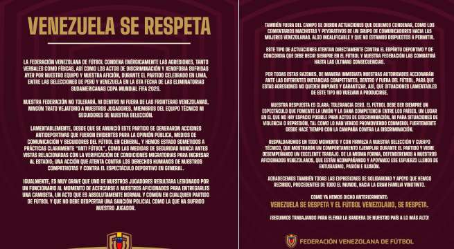 Por su parte, la Federación Venezolana de Fútbol (FPF) emitió un comunicado a través de redes sociales “condenando las agresiones y actos de xenofobia” que sufrieron sus seleccionados e hinchas en territorio peruano. Esperan que pronto los entes competentes se pronuncien al respecto y emitan las sanciones correspondientes.