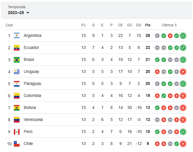 TABLA DE POSICIONES DE LAS ELIMINATORIAS SUDAMERICANAS