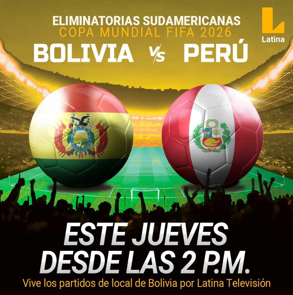 Latina Televisión (Canal 2) será la señal en vivo que transmitirá el partido entre Perú vs. Bolivia por la fecha 5 de las Eliminatorias Sudamericanas 2026. Recuerda que este cotejo lo podrás seguir por nuestros portales web y YouTube.
