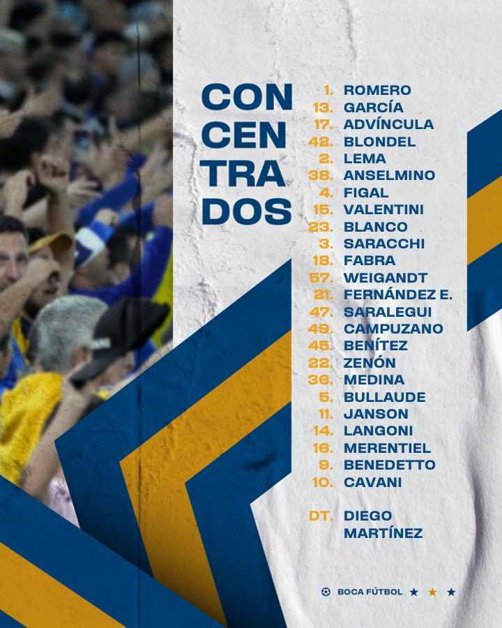 - Boca Juniors: Sergio Romero; Luis Advíncula, Cristian Lema, Jorge Figal, Lautaro Blanco; Equi Fernández, Cristian Medina, Kevin Zenón, Ezequiel Bullaude, Edinson Cavani y Miguel Merentiel.