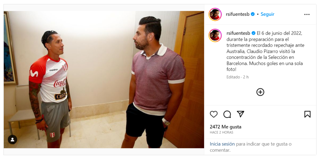 “El 6 de junio del 2022, durante la preparación para el tristemente recordado repechaje ante Australia, Claudio Pizarro visitó la concentración de la Selección en Barcelona. Muchos goles en una sola foto”, precisó el comunicador en su cuenta oficial de Instagram.
